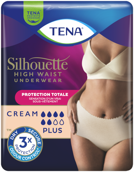 Sous-vêtement absorbant, élégant et discret pour femmes. Les sous-vêtements TENA Silhouette Plus Taille haute offrent une protection totale contre les fuites urinaires modérées à fortes. Idéal pour les femmes qui viennent d’accoucher.